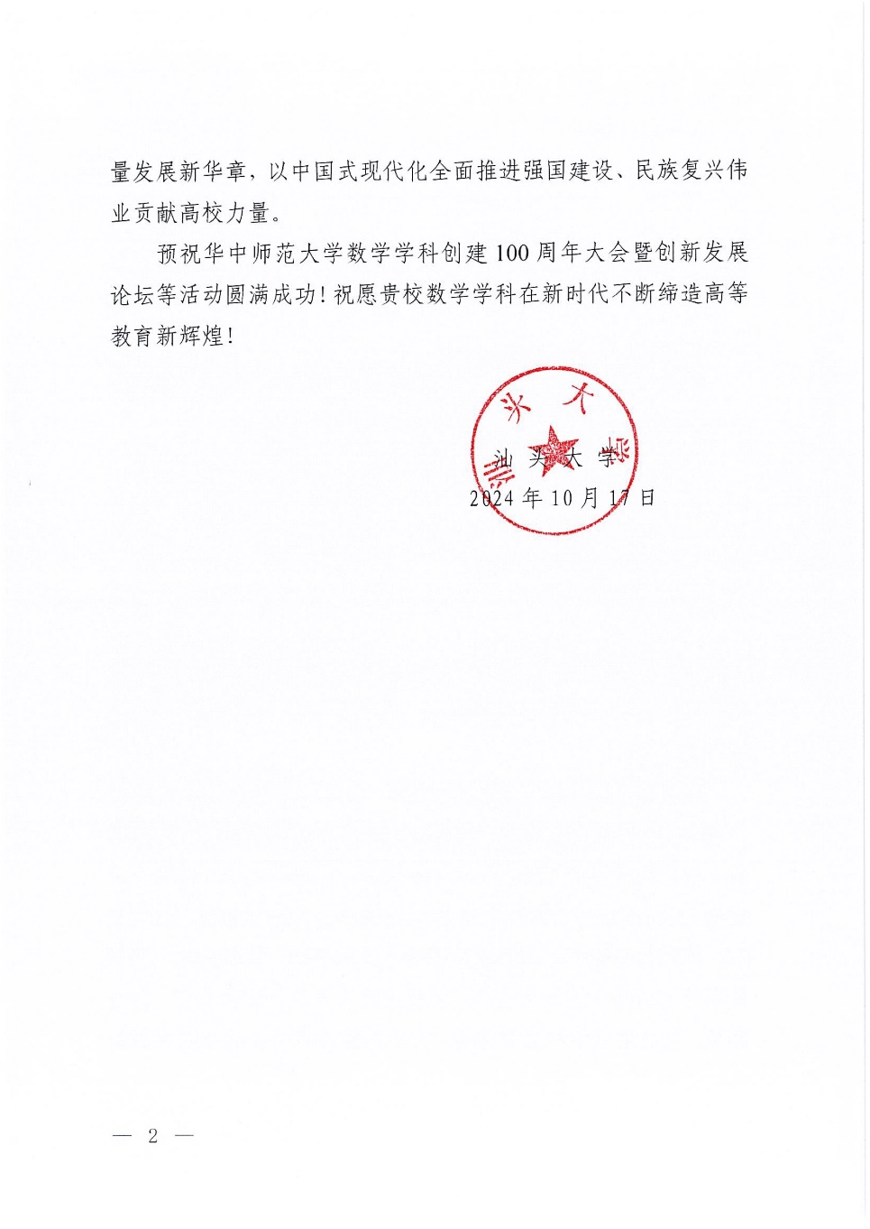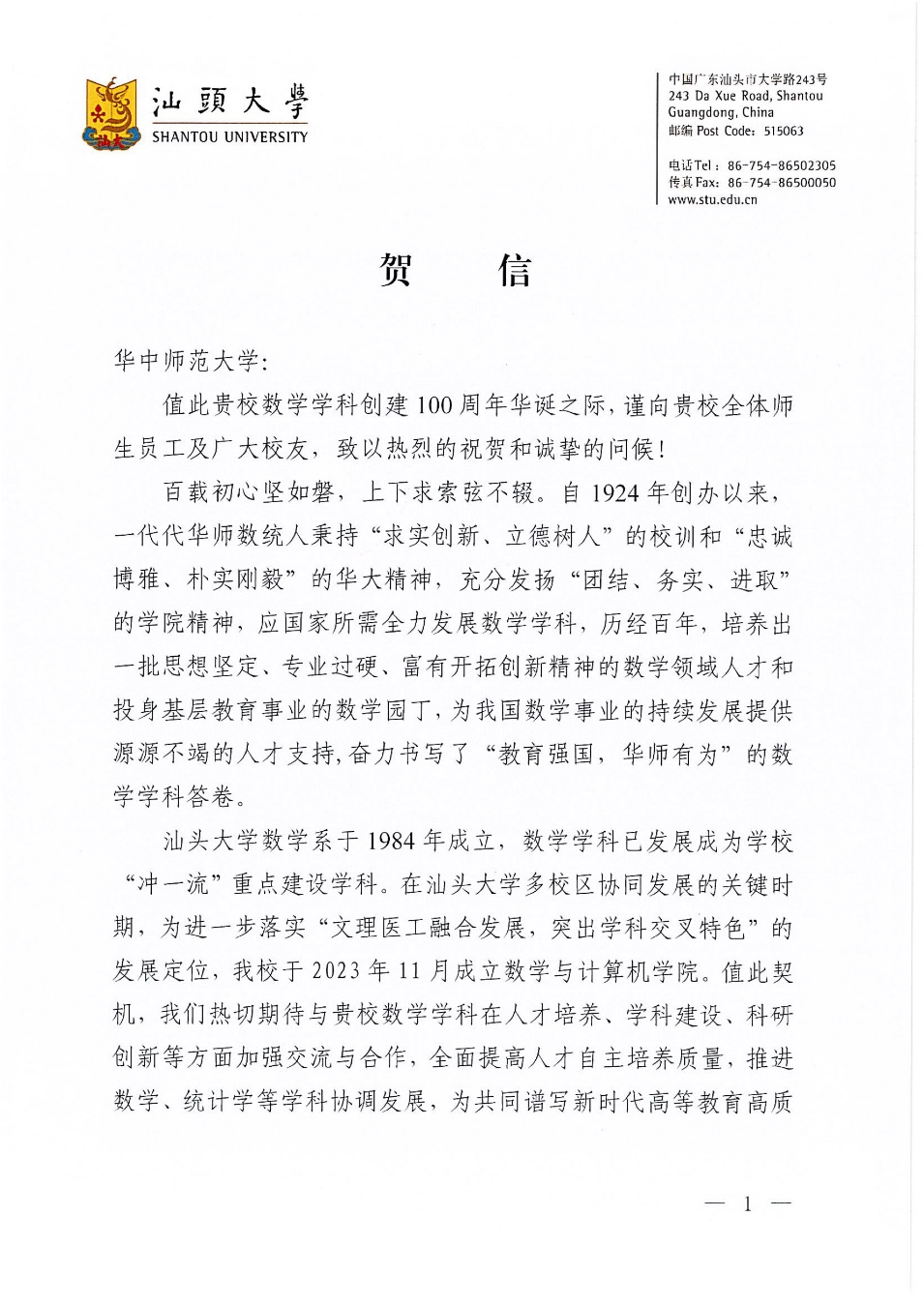 (通讯员 李佳乐)在我校“数学学科创建100周年大会暨创新发展论坛”即将召开之际,汕头大学向我校发来贺信。